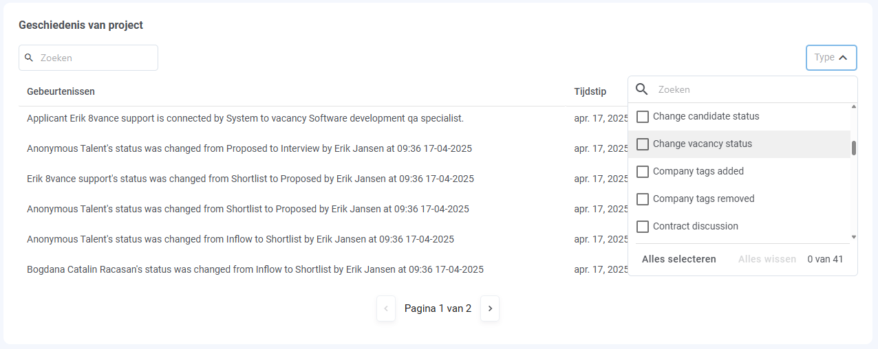 Wanneer je op zoek bent in de geschiedenis van het project naar een specifieke actie kun je gemakkelijk de filter gebruiken om het zoeken eenvoudiger te maken.