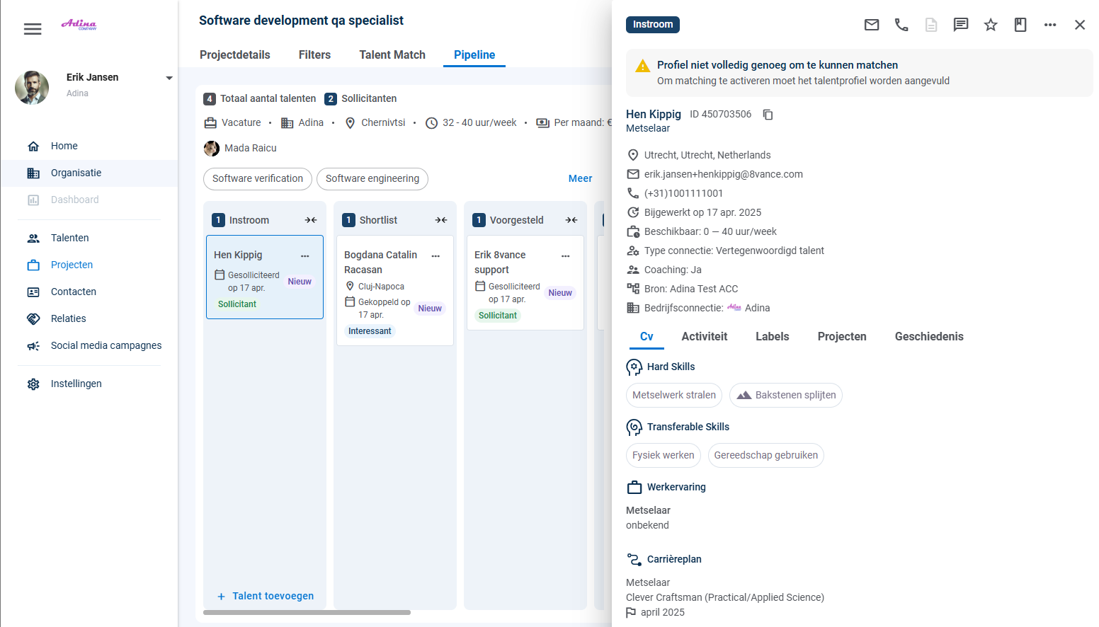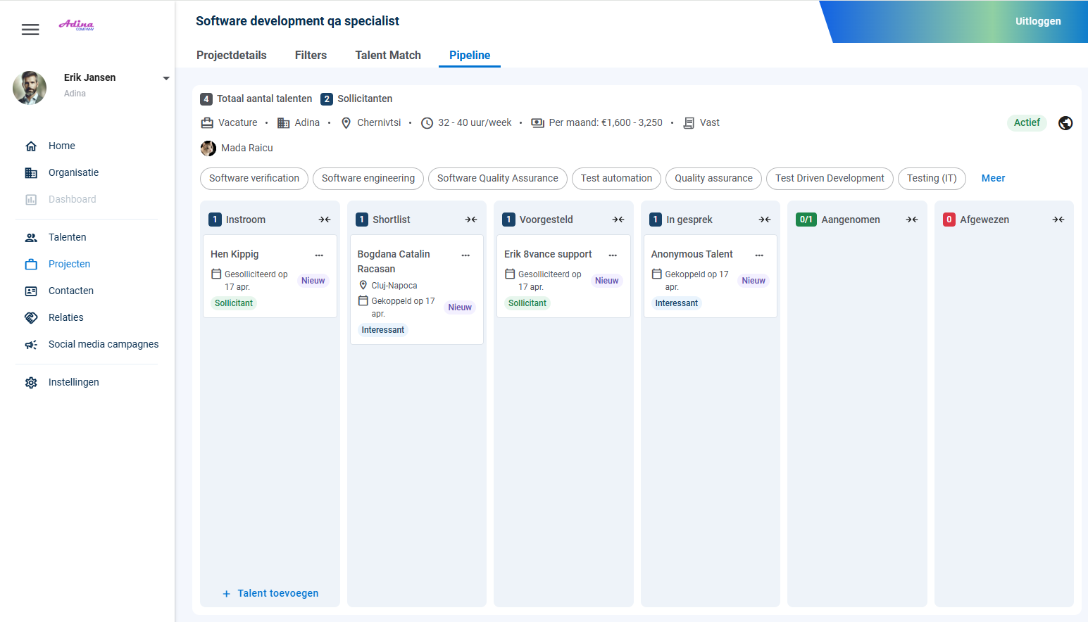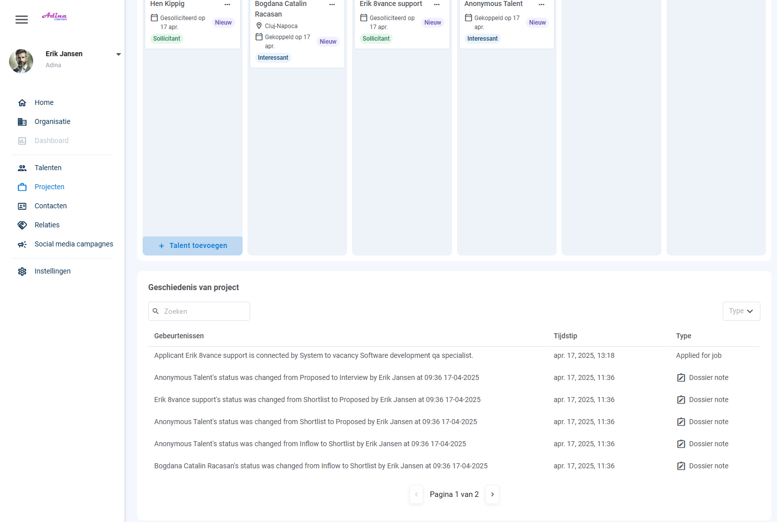 Zoals eerder al beschreven komen je talenten gekoppeld aan het project automatisch in de pipeline binnen.